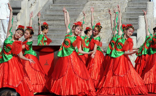 中新网10月12日电 今天上午10:18分,北京天坛祈年殿前广场,随着游泳世界冠军、北京籍运动员张琳从中共中央总书记、国家主席胡锦涛手中接过点燃的亚运火炬,广州亚运圣火北京传递也随之拉开了帷幕。
