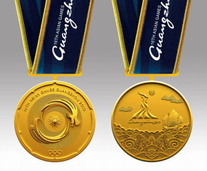 其中,亚运会奖牌,正面设计将亚奥理事会会徽和广州市花红图形融为一体,以立体浮雕强化视觉效果;背面构图采用翻腾浪花,中轴下文为“吉祥如意纹”,左上方为会徽、右边为“广船”图形,象征广州海洋文化背景和“乘风破浪,开拓进取”的精神。