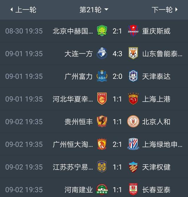 北京时间9月3日,截止发稿时,中超联赛第21轮的8场比赛已经全部赛完,赛果如下:北京国安2-1重庆斯威,大连一方4-2山东鲁能,广州富力2-0天津泰达,河北华夏1-1上海上港,贵州恒丰1-1北京人和,广州恒大2-1上海申花,江苏苏宁1-1天津权健,河南建业1-1长春亚泰。