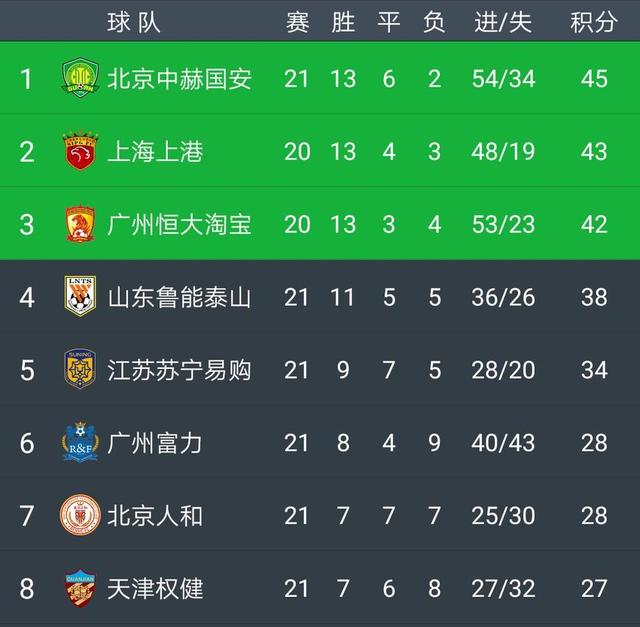在最新的中超积分榜上,得利于上海上港的平局,北京国安目前以45分排在了榜首,而领先的,正好是上港平局丢掉的2分。上港虽然以43分排在第二,但是他们身后的恒大已经来势汹汹,双方将在9月18日有一场补赛,胜者很可能会超越国安成为榜首。目前恒大在经历了夏季的引援之后,状态非常神勇,世界杯后的8轮比赛他们取得了7胜1负的佳绩,只要能在补赛中击败上港,恒大将会无限接近中超联赛的8连冠!