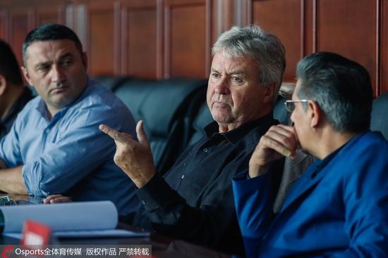 中场休息,希丁克没有离开座位,他拿纸巾擦拭完眼镜后,又开始书写。之后,教练组三人开始开会,希丁克话不多,只是在倾听,偶尔点头。