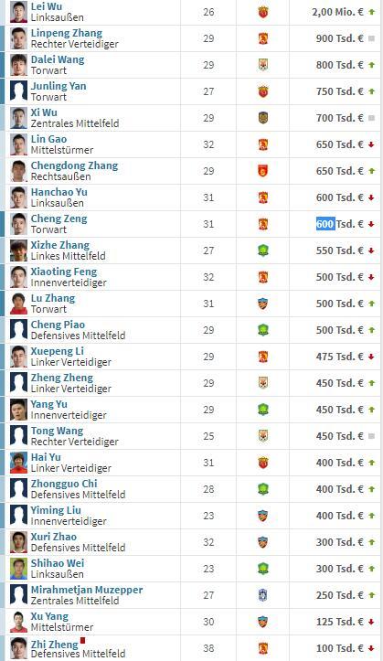 德国转会市场网(Transfermarkt)更新了最新一期中国国家队球员身价排行榜。在这份榜单中,效力于上港的武磊以200万欧元高居榜首,队长郑智因年龄的原因身价仅为10万欧。