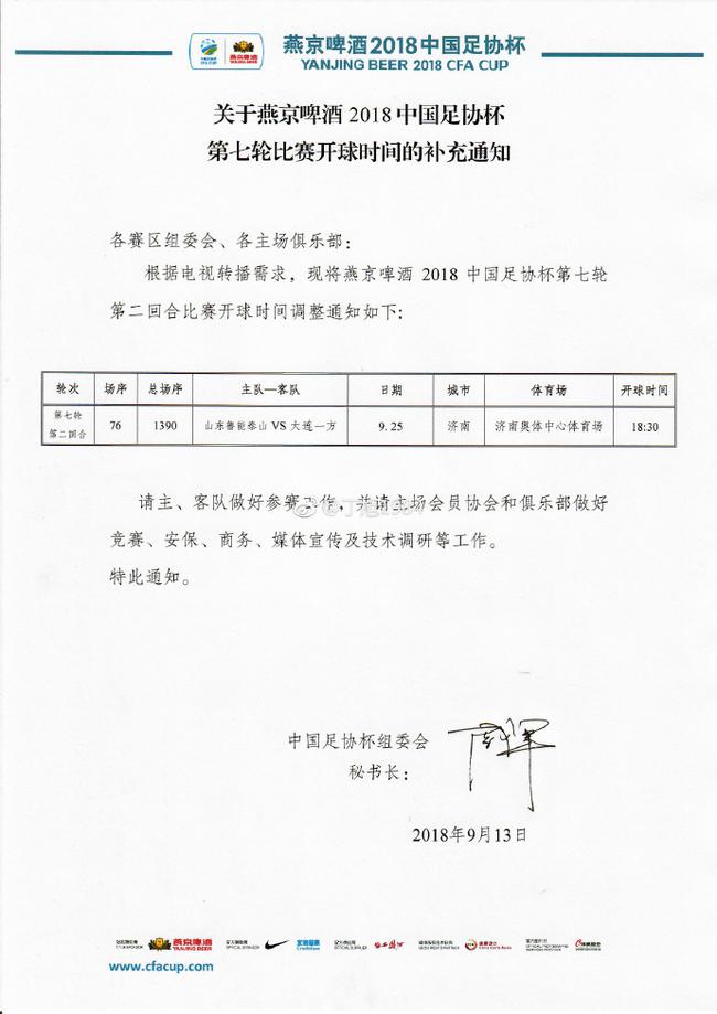 9月13日,足协杯官方发布通知,足协杯半决赛山东鲁能主场与大连一方的比赛将改为9月25日,18:30分进行。