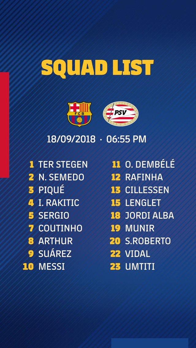 北京时间9月19日凌晨,欧冠小组赛首轮,巴萨将在主场迎战埃因霍温。赛前巴萨官方公布18人大名单: