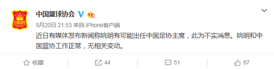 新华社北京9月20日电 中国篮协20日针对“姚明有可能出任中国足协主席”的传闻发表声明,称该传闻为“不实消息”,姚明和中国篮协工作正常,无相关变动。