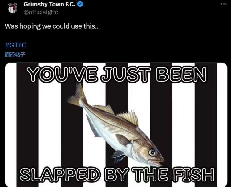 如此悬殊的实力差距下,格林斯比创造惊天冷门,赛后俱乐部社媒发图玩梗:“你刚被鱼扇了一耳光。”配图则是一条黑线鳕鱼,格林斯比曾是曾是世界最大的渔港之一,以捕捞黑线鳕鱼为主要产业,格林斯比队的队徽上就包含海鱼和海船的元素。这一夜,曼联是被冷冷的冰鱼在脸上胡乱的拍。