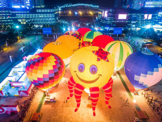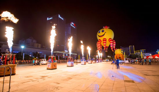 开幕式当晚的桔山广场,可谓是光与火的交织。配合着主持人的口令,亮球仪式展现出夜间最精彩的画面。暗夜黑幕背景下,在广场中竖立着五颜六色的热气球,当燃烧器向球体喷射出绚丽的火焰时,热气球宛如色彩斑斓的巨大灯笼,再将燃烧器喷火和上音乐节拍,球体便有节奏地闪烁起来,仿佛在翩翩起舞,景象美轮美奂,整个兴义市沉浸于浪漫的光海之下。