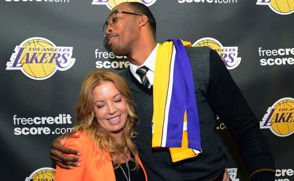 2012年霍华德加盟湖人发布会上,霍华德当众拥抱珍妮-巴斯
