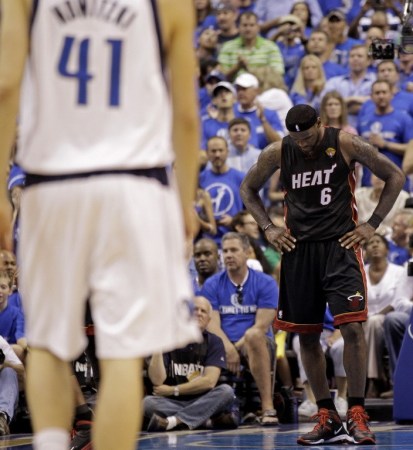 尽管勒布朗在东部半决赛成功复仇凯尔特人、东部决赛轻取公牛,但当总决赛面对神乎其神的德克和小牛时,勒布朗和热火却难堪地坠入地狱,他场均仅得17.8分,甚至还有单场8分的尴尬数据。而在球场之外,勒布朗不尊重对手的言行也让他成为世人眼中幼稚的恶人。