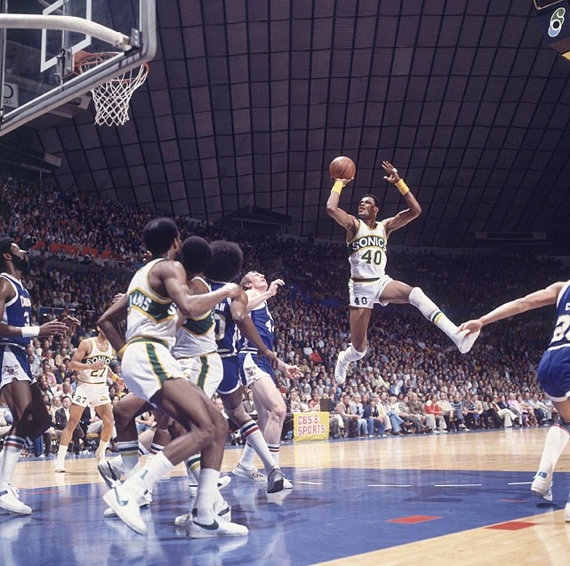 超音速战掘金,7尺长人马文-韦伯斯特沿着禁区飞翔的动作非常优美,韦伯斯特只在西雅图效力了一个赛季,场均得到14分。
