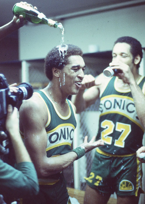 超音速后卫丹尼斯-约翰逊被队友浇灌香槟,前锋约翰-约翰逊也在另一旁庆祝,这是在1979年总决赛第5场比赛后超音速更衣室内的场景。超音速在总决赛中4-1击败子弹队夺得队史上唯一一个总冠军。他们还曾在1978年和1996年杀入总决赛。