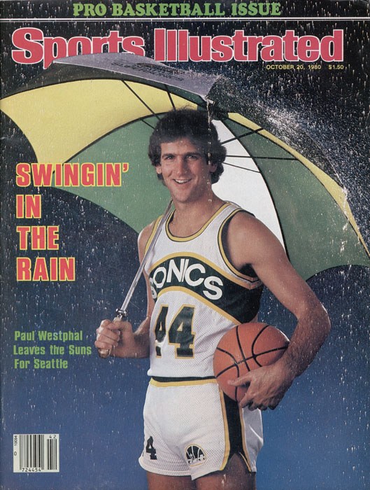 后卫保罗-韦斯特法尔一手拿着雨伞、一手抱着篮球,面露微笑为SI拍摄1980年的篮球封面,那个赛季韦斯特法尔离开太阳加盟超音速。韦斯特法尔12年职业生涯只在超音速打了一个赛季,场均20分多点,他帮助球队杀进了西部决赛。