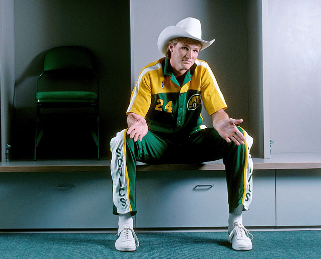 1988年,前锋汤姆-钱伯斯在西雅图大体育场展示他的牛仔装扮。钱伯斯在1981年首轮被快船选中,他在西雅图打了5个赛季。