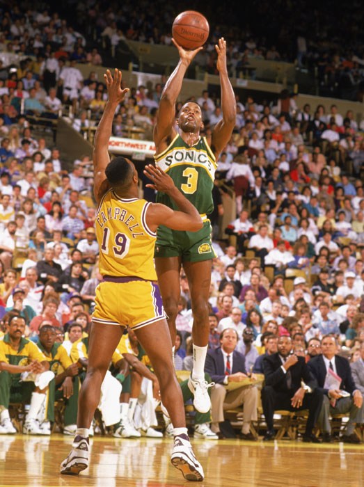 1988年,戴尔-艾利斯在托尼-坎贝尔面前跳投,从1986-87赛季一直到1989-90赛季,艾利斯一直是球队的头号得分手。