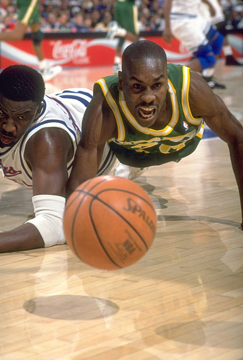 1993年超音速与萨克拉门托国王的一场比赛,加里-佩顿倒地与对手抢球。因为出色的防守以及在场上积极不惜命,佩顿有着“手套”的美称。