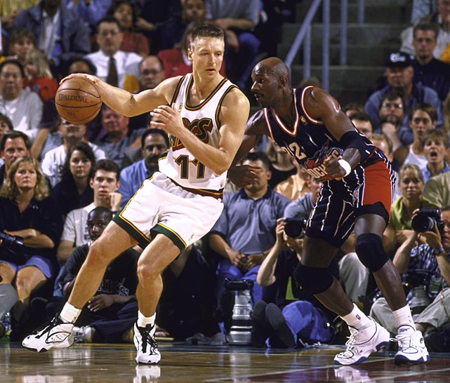 1994年超音速在钥匙球馆战太阳,主帅乔治-卡尔给加里-佩顿下指令。这两位在一起搭档整整6个赛季,他们最好的一个赛季是1995-96赛季,那个赛季他们闯入总决赛,却以2比4负于公牛。