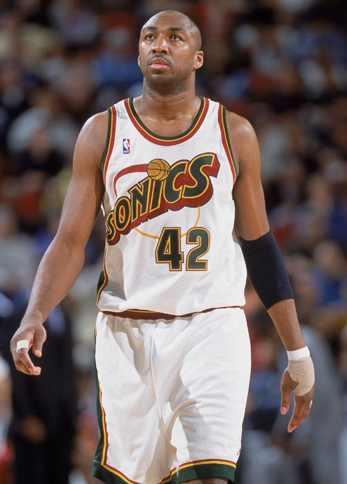 2001年超音速在主场钥匙球馆迎战火箭,文-贝克在赛中凝视记分牌。贝克在西雅图效力5个赛季,1997-98赛季他的得分和篮板都领跑全队。贝克和佩顿作为超音速的队友,曾一起征战奥运会。