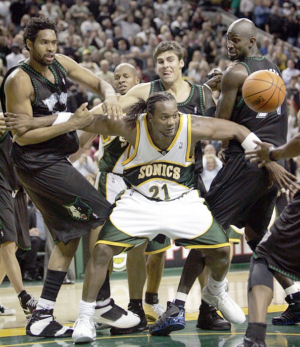 2005年超音速在季后赛首轮中碰到萨克拉门托国王,在雷-阿伦的带领下超音速4-1晋级,图为第5场比赛阿伦在比赛中上篮。2007年6月,阿伦加盟凯尔特人。